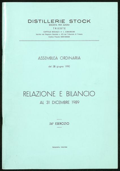 Distillerie Stock Società per Azioni. Trieste. Relazione e bilancio al 31 dicembre 1989 approvato dall’Assemblea ordinaria del 28 giugno1990 Luogo e data: Trieste, 1990Collocazione: ASTS, Archivio Stock, b. 225