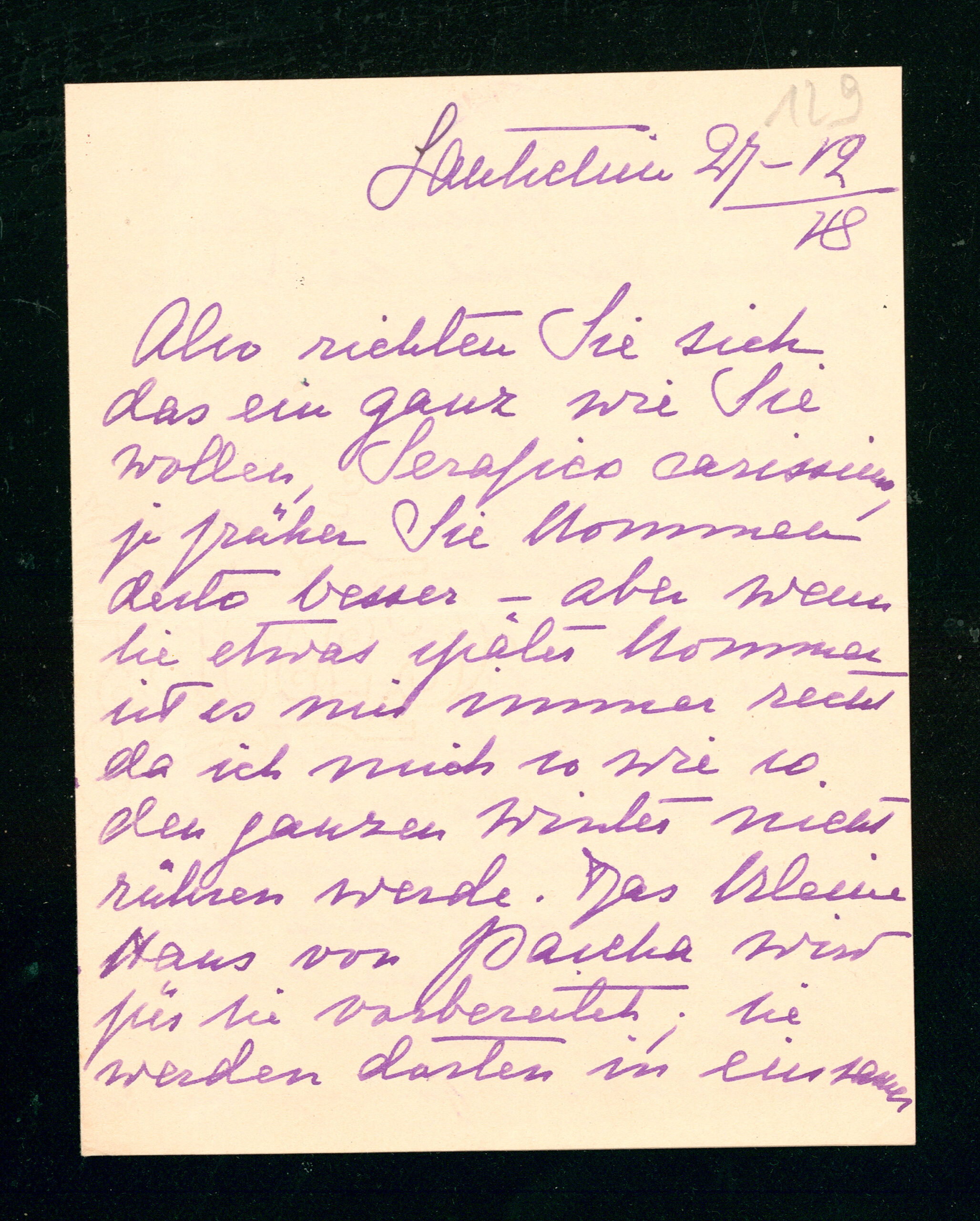 Ich weiß nicht ob Sie meinen letzten Brief erhalten haben? Bitte also, lieber D. S. theilen Sie sichs ein wie Sie wollen, aber lassen Sie mir a tempo wissen - wenigstens acht Tage früher - damit man das kleine Haus ordentlich durchheizt - außer es ist Ihnen recht einige Tage hier zu bleiben - ich meine im Schloß, - bis es im Häuschen warm ist. - Ich denke daß Vera Czernin mit ihrer wunderschönen Tochter (ein Leonardo, zu merkwürdig!) auch bald kommt. Sonst niemand.