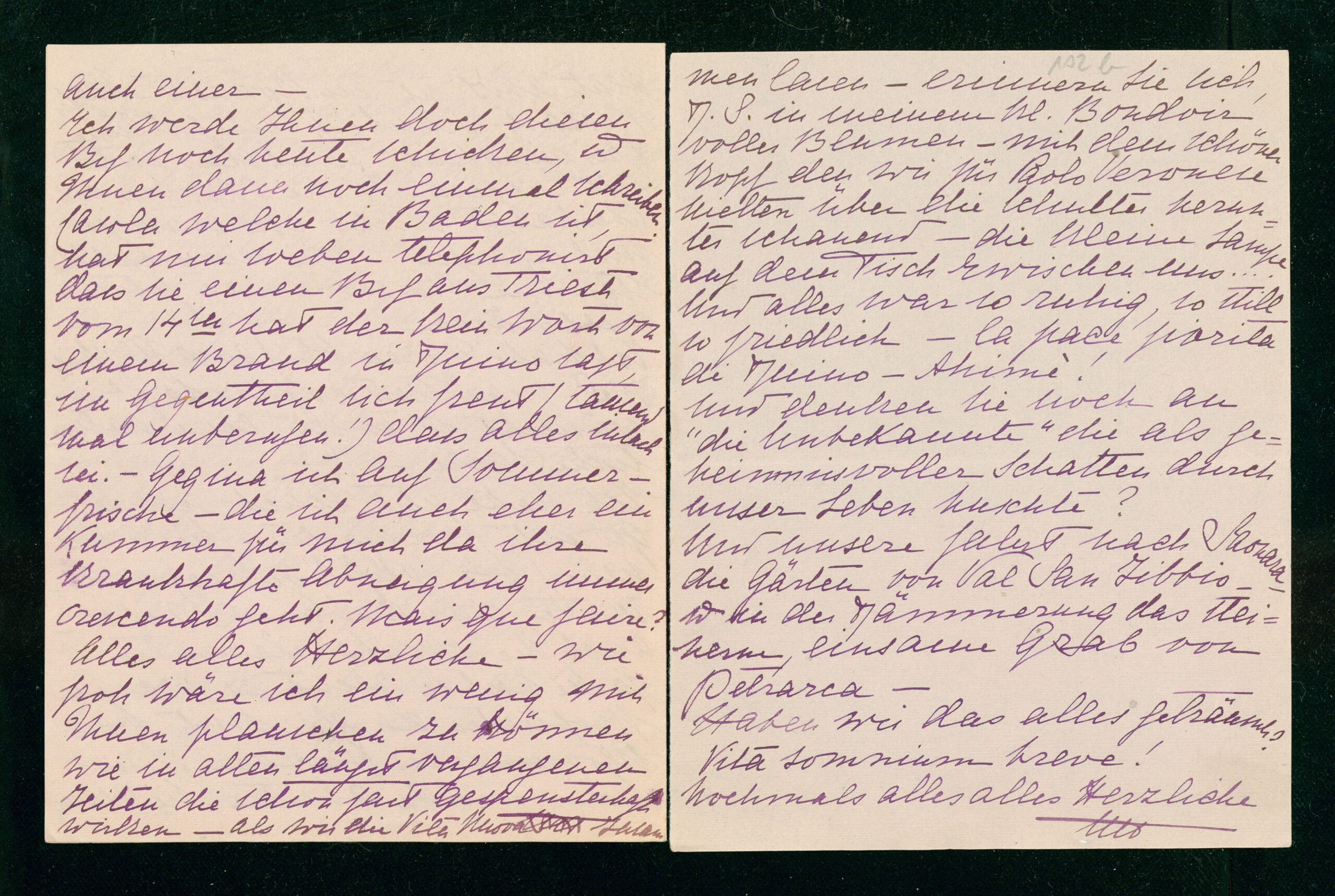 Alles alles Herzliche - wie froh wäre ich ein wenig mit Ihnen plauschen zu können wie in alten längst vergangenen Zeiten die schon fast gespensterhaft wirken - als wir die Vita Nuova zusammen lasen - erinnern Sie sich, D. S. in meinem kleinen Boudoir voller Blumen - mit dem schönen Kopf den wir für Paolo Veronese hielten über die Schulter herunter schauend - die kleine Lampe auf dem Tisch zwischen uns .... Und alles war so ruhig, so still so friedlich - la pace fiorita di Duino - Ahimè!