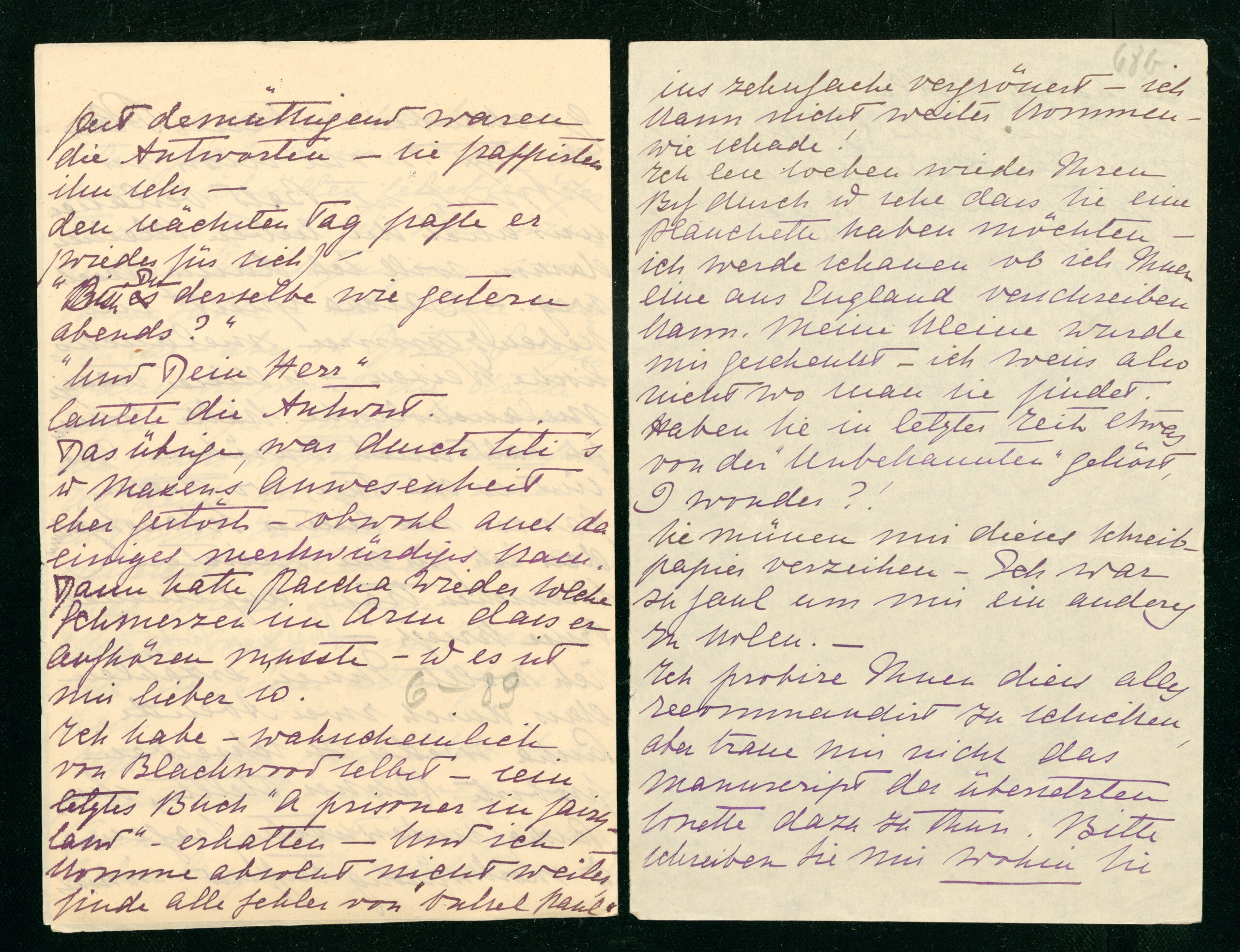 Ich lese soeben wieder Ihren Brief durch und sehe daß Sie eine Planchette haben - möchten - ich werde schauen ob ich Ihnen eine aus England verschreiben kann. Meine kleine wurde mir geschenkt - ich weiß also nicht wo man sie findet. Haben Sie in letzter Zeit etwas von-der«Unbekannten» gehört, I wonder?! Sie müssen mir dieses Schreibpapier verzeihen - Ich war zu faul um mir ein anderes zu holen. -