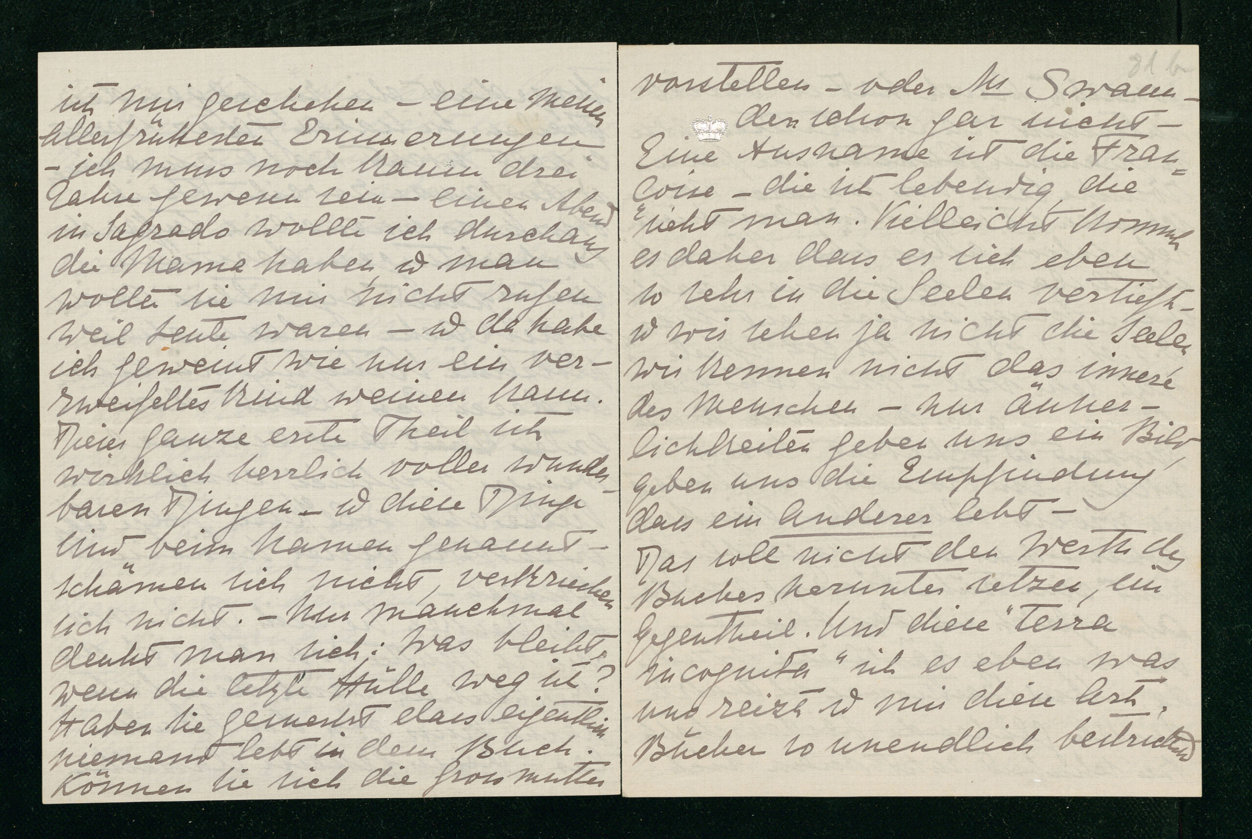 Ich habe einen ganz einsamen ruhigen Abend, Dottor Serafico - einen Abend der mich an andere einsame Abende erinnert - long long ago - wo ich als die Kinder - die drei Buben, - schlafen gegangen waren, mich bis spät in der Nacht in die «Philosophie der Mystik» von Du Prel vertiefte. Und wie damals in der großen Stille glaube ich die Zeit rauschen zu hören. Erinnern Sie sich «die Zeiten rauschen wie Wälder» ... Ich habe das Gedicht von der Fürstin Lichnowsky gelesen - ein merkwürdig herbes hartes Gedicht - man liest es nicht gerne, man erinnert sich es nicht gerne - aber man muß es sich erinnern. Die Frau ist sonderbar - anders als die anderen - sie sollte nicht schreiben, sie sollte alle ihre Träume für ihre Söhne aufsparen. Keine Frau die noch Söhne haben kann sollte schreiben ...