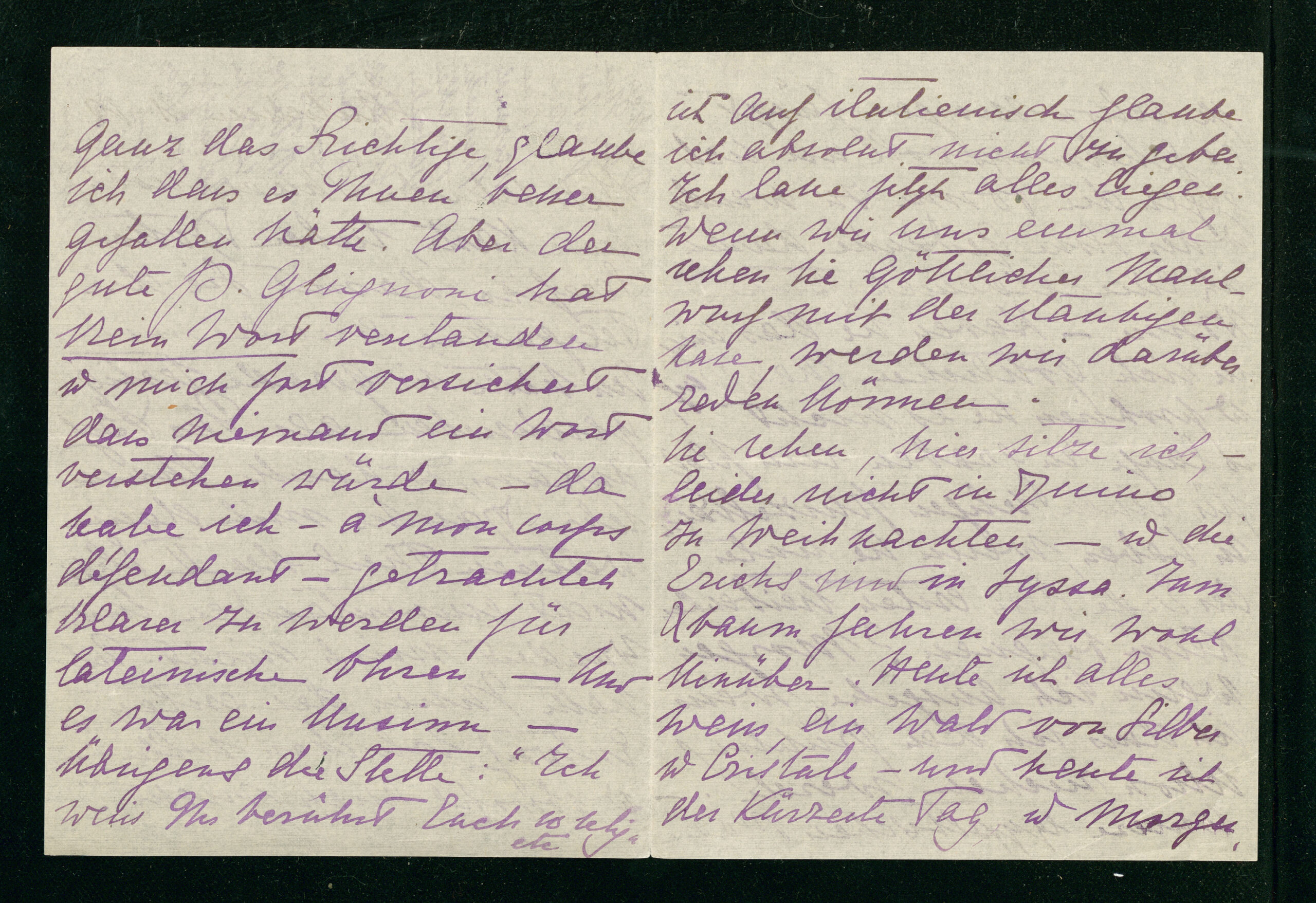 Trascrizione: Ich schicke Ihnen noch diese Karte, lieber Dottor Serafico, damit Sie die Telepathie anerkennen. Ich hatte sie gerade fertig geschrieben als Ihr Brief ankam, und danke Ihnen sehr. Daß Sie mit dem weiteren Theil der II Elegie nicht einverstanden sind wundert mich nicht. Ich hätte Ihnen den ersten Entwurf schicken sollen - und obwohl auch nicht ganz das Richtige, glaube ich daß es Ihnen besser gefallen hätte. Aber der gute P(adre) Ghignoni hat kein Wort verstanden und mich fort versichert daß Niemand ein Wort verstehen würde - da habe ich - à mon corps défendant - getrachtet klarer zu werden für lateinische Ohren - Und es war ein Unsinn - Übrigens die Stelle: «Ich weiß Ihr berührt Euch so selig» etc. ist auf italienisch glaube ich absolut nicht zu geben. Ich lasse jetzt alles liegen. Wenn wir uns einmal sehen, Sie Göttlicher Maulwurf mit der staubigen Nase, werden wir darüber reden können.