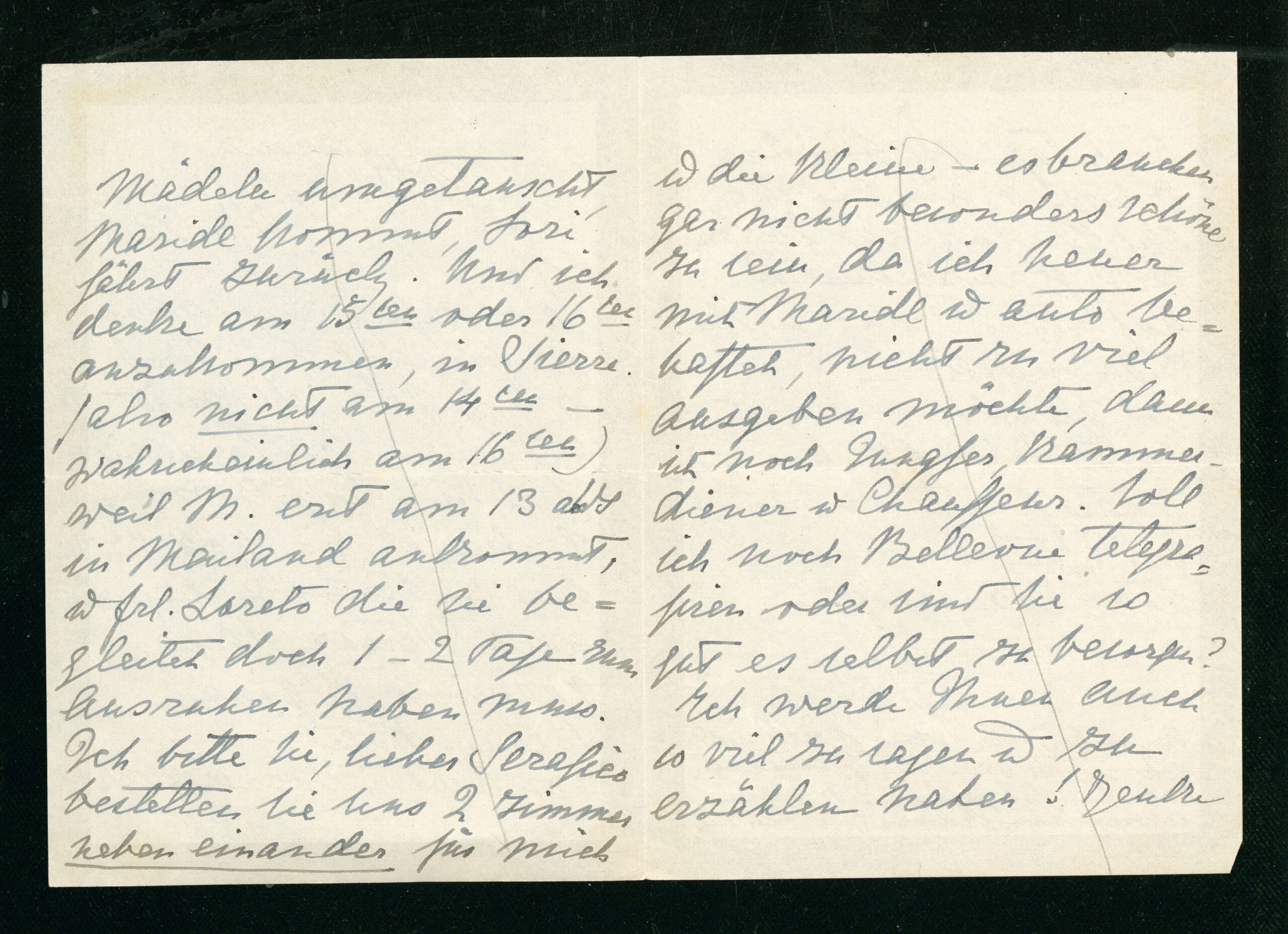 Von dorten werden die Mädeln umgetauscht, Maridl kommt, Lori fährt zurück. Und ich denke am 15ten oder 16ten anzukommen, in Sierre (also nicht am 14ten - wahrscheinlich am 16ten) weil M(aridl) erst am 13 abends in Mailand ankommt, und Frl. Loreto die sie begleitet doch 1-2 Tage zum Ausruhen haben muß. Ich bitte Sie, lieber Serafico bestellen Sie uns 2 Zimmer neben einander für mich und die Kleine - es brauchen gar nicht besonders schöne zu sein, da ich heuer mit Maridl und Auto behaftet, nicht zu viel ausgeben möchte, dann ist noch Jungfer, Kammerdiener und Chauffeur. Soll ich noch Bellevue telegrafiren oder sind Sie so gut es selbst zu besorgen?