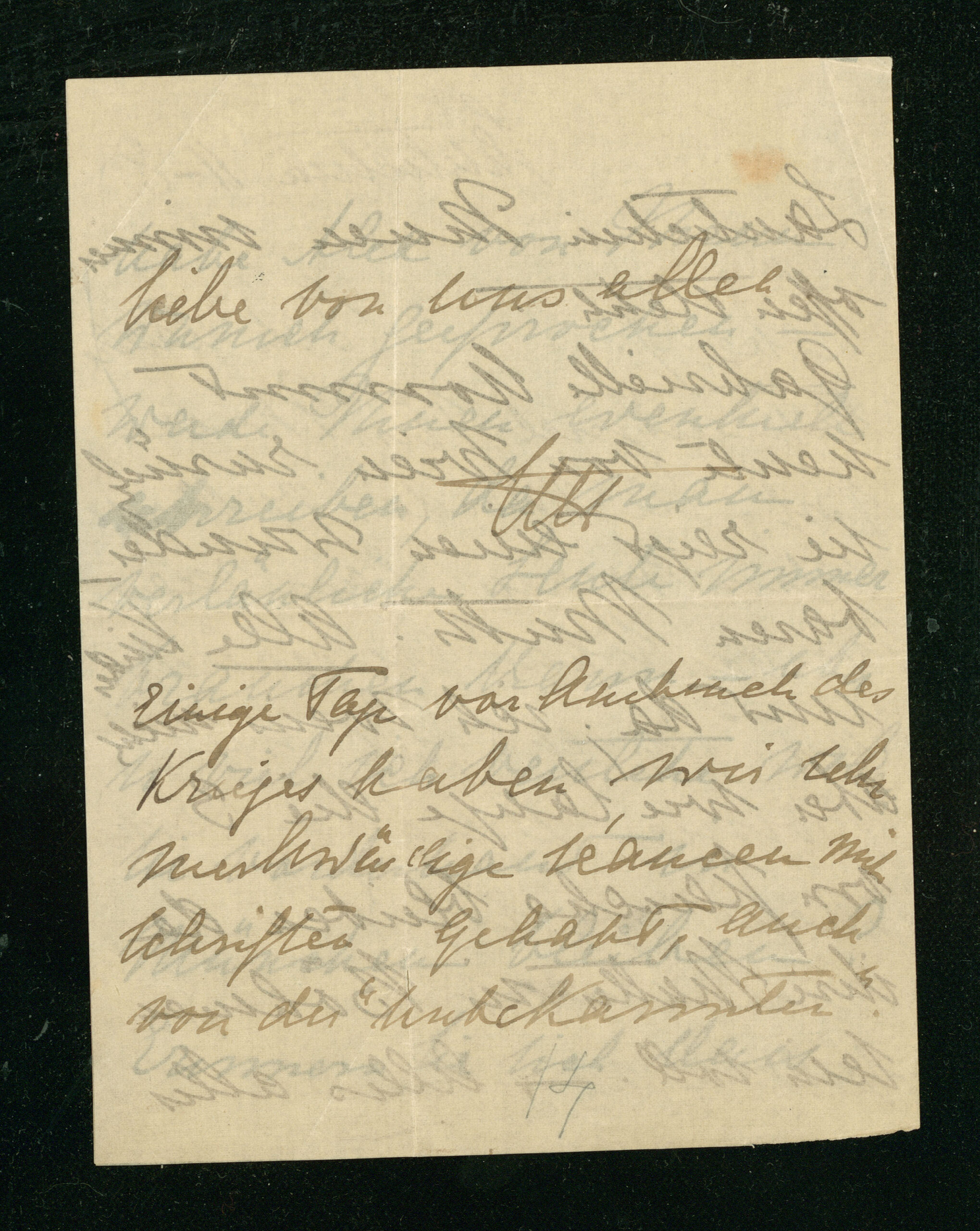 Trascrizione: Lieber D. S. - Ich danke tausendmal für Ihren Brief. Sie werden vielleicht schon wissen daß meine beiden Söhne eingerückt sind. Pascha ist in Bosnien, Erich in Galizien. Mehr sage ich Ihnen nicht. Ich weiß Sie fühlen mit uns. - Ich habe Alex von Ihrem Wunsch gesprochen - werde Ihnen eventuell schreiben, da man verläßliche Leute immer brauchen kann - aber so viel ich verstehe wollen Sie vorderhand in München bleiben? Erinnern Sie sich daß Lautschin Ihnen immer offen steht.