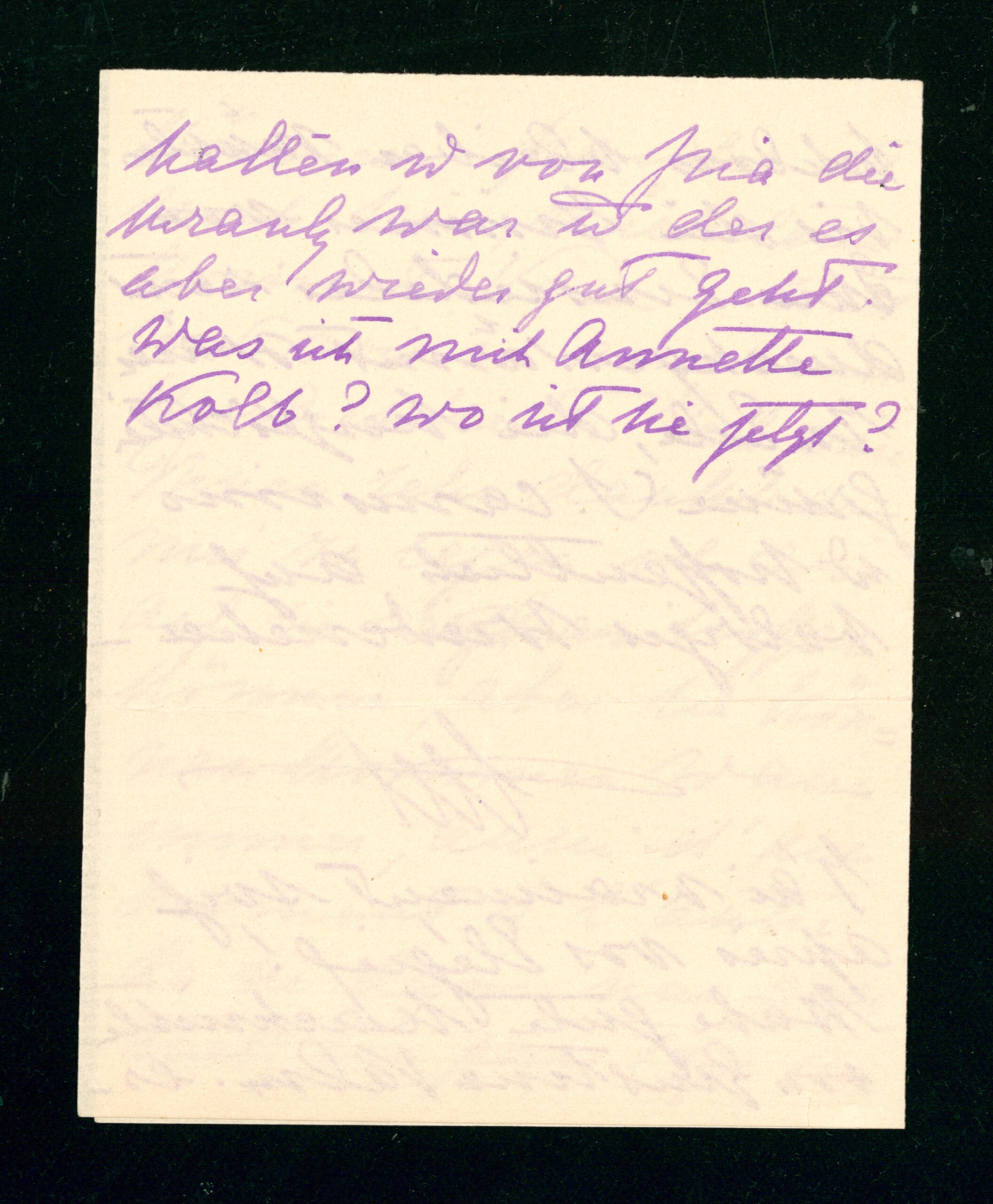 Habe gute Nachrichten von Giustina Valm(arana) erhalten und von Pia die krank war und der es aber wieder gut geht. Was ist mit Annette Kolb? wo ist sie jetzt?
