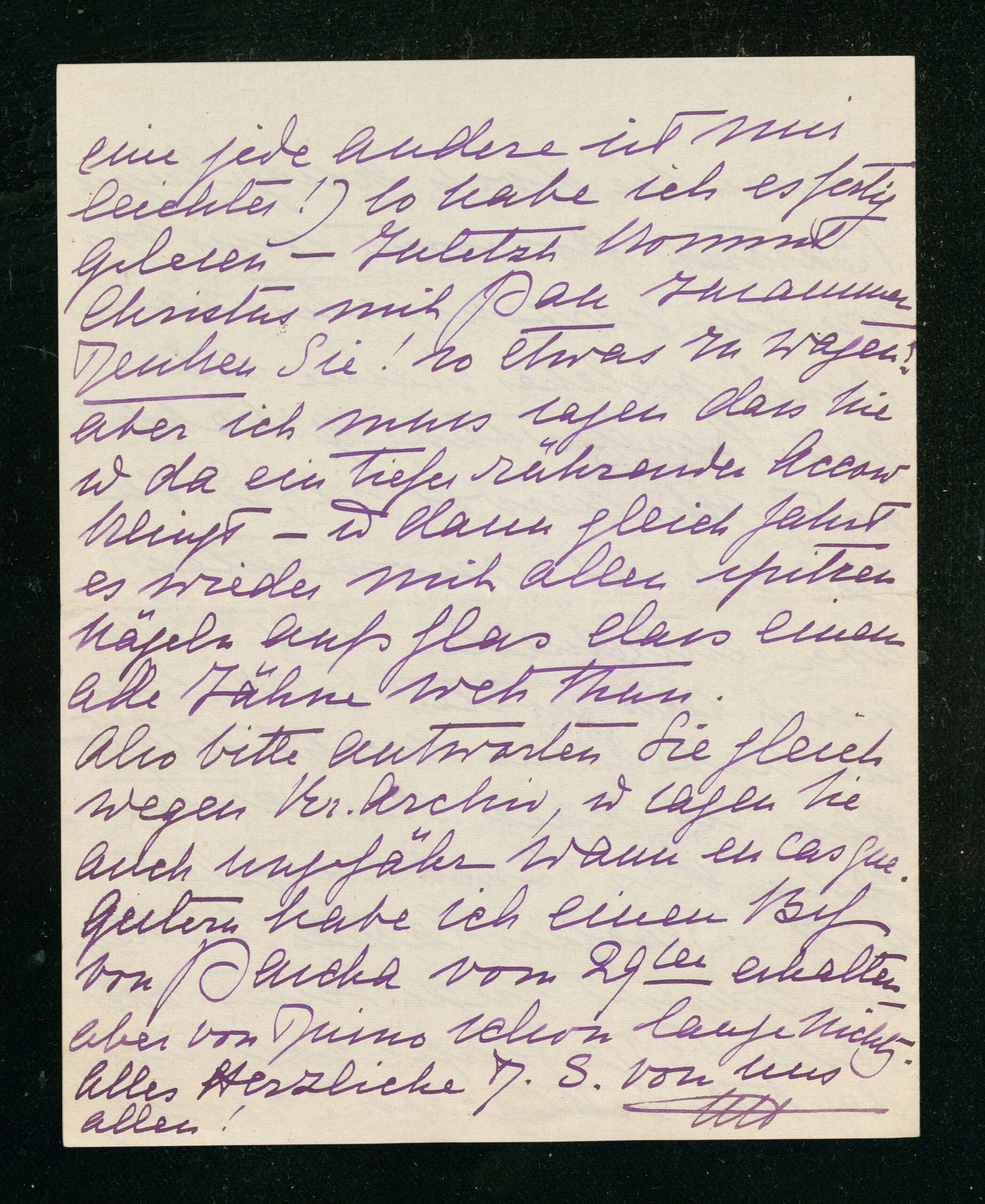 Also bitte antworten Sie gleich wegen Kr(iegs) Archiv, und sagen Sie auch ungefähr wann en cas que. Gestern habe ich einen Brief von Pascha vom 29ten erhalten - aber von Duino schon lange nichts. Alles Herzliche D. S. von uns allen!