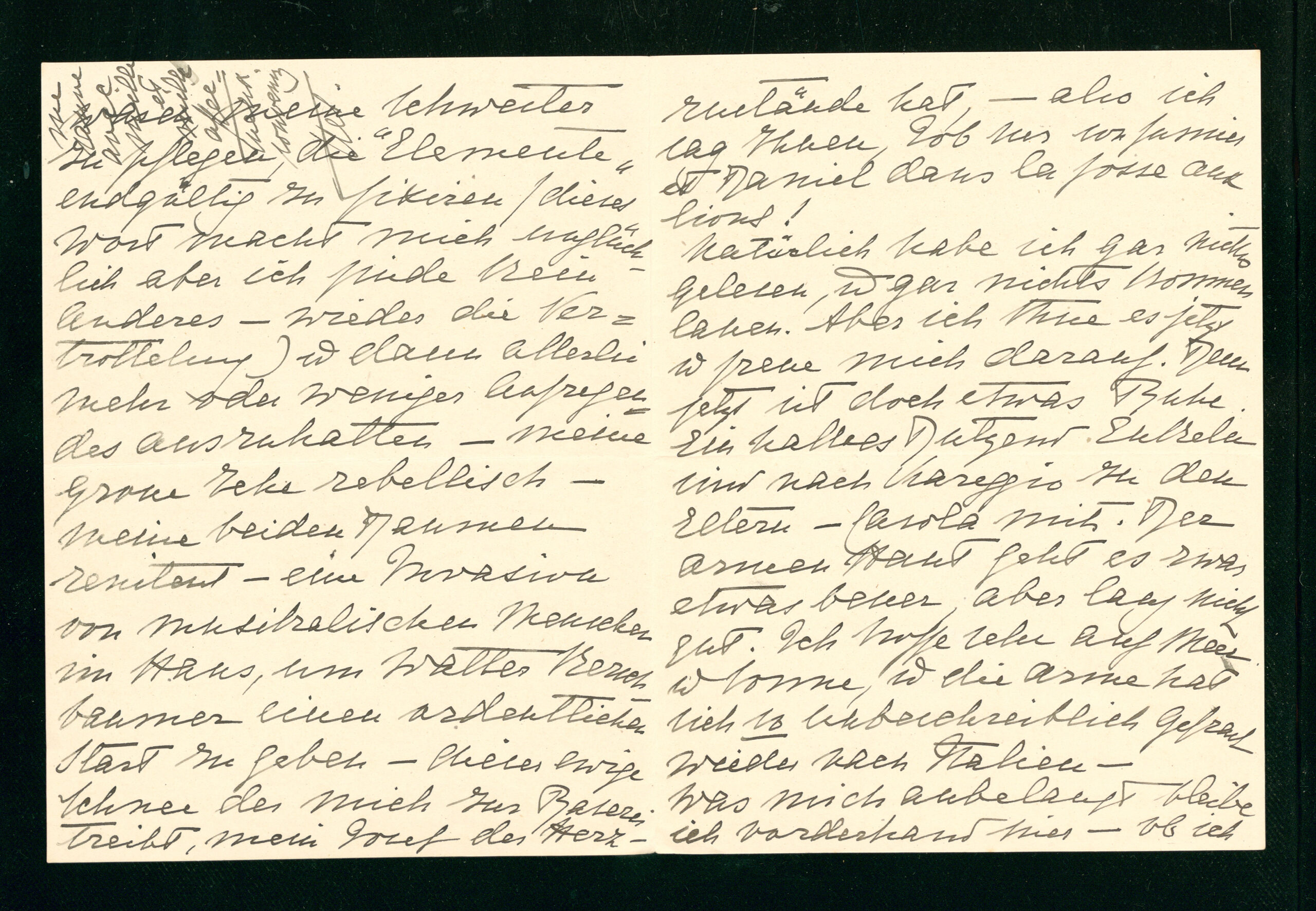 Trascrizione: Serafico carissimo - habe ich Ihnen geschrieben? habe ich Ihnen nicht geschrieben? habe ich Ihnen gedankt für die excellente kleine Photographie und für die Titeln der Bücher? Das weiß ich alles nicht mehr - et vous comprendrez combien ces symptômes de betification progressive, sont inquiétants. Mais vous ne vous figurez pas diese unmenschliche Hetze! Meine beiden Enkelinnen zu bemuttern, da die Eltern nach Italien abgedampft waren, meine Schwester zu pflegen, die «Elemente» endgültig zu fixiren (dieses Wort macht mich unglücklich aber ich finde kein anderes - wieder die Vertrottelung) und dann allerlei mehr oder weniger Aufregendes auszuhalten - meine große Zehe rebellisch - meine beiden Daumen renitent - eine Invasion von musikalischen Menschen im Haus, um Walter Kerschbaumer einen ordentlichen Start zu geben - dieser ewige Schnee der mich zur Raserei treibt, mein Josef der Herzzustände hat, - also ich sag Ihnen, Job sur son fumier et Daniel dans la fosse aux lions!
