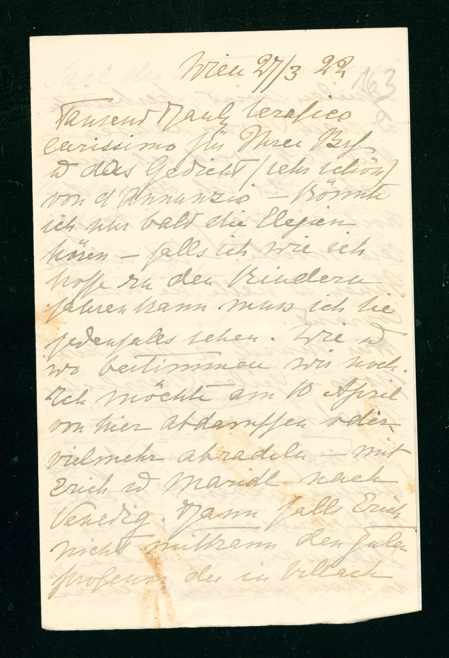 Trascrizione: Tausend Dank Serafico carissimo für Ihren Brief und das Gedicht (sehr schön) von d'Annunzio - Könnte ich nur bald die Elegien hören - falls ich wie ich hoffe zu den Kindern fahren kann muß ich Sie jedenfalls sehen. Wie und wo bestimmen wir noch. Ich möchte am 10 April von hier abdampfen oder vielmehr abradeln - mit Erich und Maridl nach Venedig. Dann falls Erich nicht mitkann den guten Professor der in Villach spielen wird, herbeirufen und nach Rom sausen - Viel Zeit werd ich nicht haben, da ich dann doch noch ein wenig in Venedig sein möchte. - Ich schreibe Ihnen und halte Sie au courant.